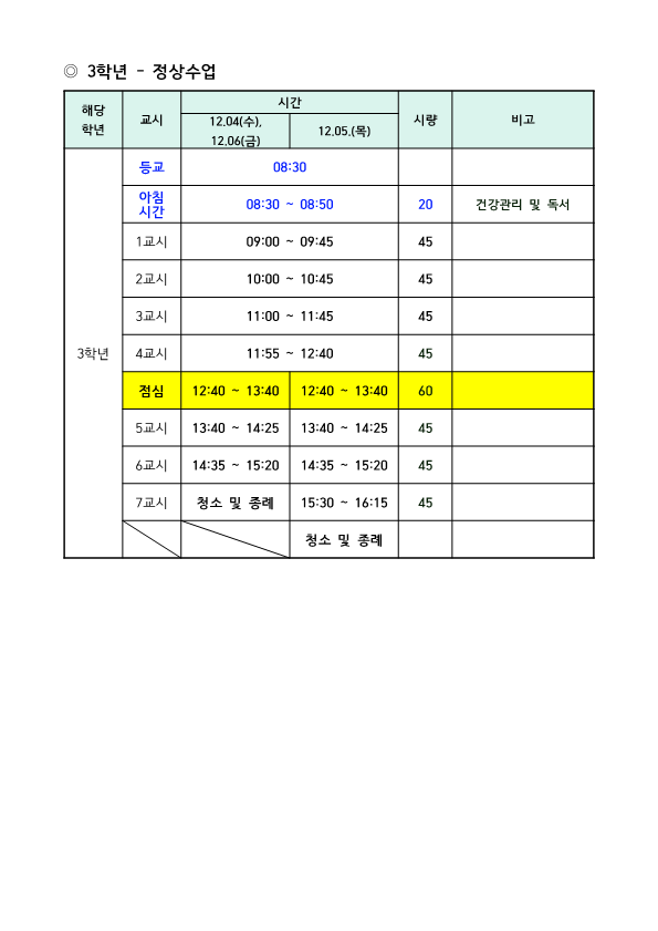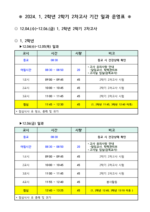 2024. 1, 2학년 2학기 2차고사 기간 일과 운영표
